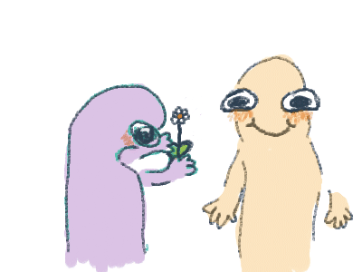 erm actually the purple one is shy about giving the yellow one a flower and the yellow one is happy bc they get a flower