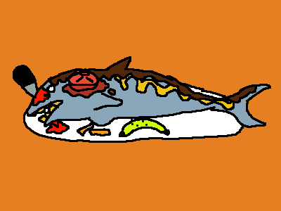 'fat cod fish covered with some hershey choclate syrup and mustard penetrated with a knife with a tomato slice reducing its moisturizer with some fries as an appetizer finishing it off with some moldy bana'