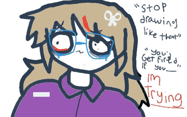 uhh so my vo-tech teacher whos trying to get us jobs in the comercial arts industry- uhhh- hes p1ssed off cuz i draw anime n shi- like hes trying to get me to draw realisticly..which is almost impossible for me to do, esp as a neurodivergent ahh mfer-