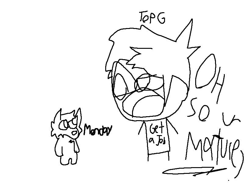 isn't at all depressed- you just wanna get attention. And you always pretend like you're better then anyone else. Like, it's obvious you're a kid- look at your writing. But other than that, you are cyber bullying people in this site, that just want to go see their friend's animations and not get harassed by some 8 year old. I'm the creator of this peice of art and I can see what you've hidden. Stop pretending like getting a job is important- There are a lot of young people on this site- definitely older and more understanding in life than you- And why you got to stop people's dreams of drawing? Animation and art is really what started the internet in the first place- It was a place where people could draw whatever they want and gain people as friends with the same interests, without having people get pissed about them. Look at back in around 2009 when there were thousands of art people and sites overpopulating the internet- Edd Gould, Newgrounds, and so many more. Why would you even decide to get on a site that had things like art that you would stop them for? It's stupid, leave us artists be and let us enjoy at least something.